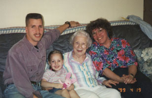 | My son-in-law Chris, my granddaughter Cassie, my Mom Esther, and me | |