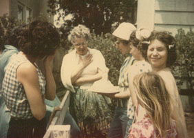| Mom, me, Linda Decker, Kay and neighbors at our fence to show off the cake Linda and I decorated | |