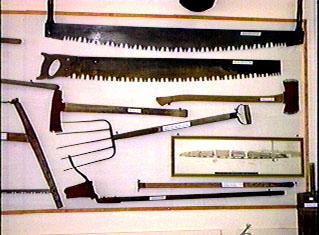 These are examples of the miners' dinner pails, boots and lanterns. Note the earlier examples of round and oval dinner pails. These held hot water in the bottom to keep the food warm. Miners typically took a pasty for their lunch. A pasty is a meat and potato meal that is baked in a piecrust, shaped something like a turn-over.