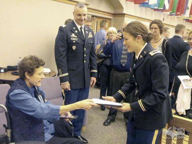 A follow-up to our Shoebox Memory last month on St. Luke's in Marquette... Edie and I are back in the Hospitality Rooms here at U.P. Health System, where she visited with the prosthetic folks Friday, and we stayed over for a follow-up on Monday. The top two photos above are graduating classes in this very complex (before it was a complex), with special note of the soldier in the top photo. Yesterday we had the privilege of attending the commissioning ceremony for Army ROTC a couple of blocks from here, and among their ranks was a graduate of the current crop of nurses at NMU. In the final photo Edie presents Stephanie Roberts with the National Defense Award from the Daughters of the American Revolution. Smiling Captain James Kolky looks on, along with Stephanie's proud Mom and Grandma behind her.