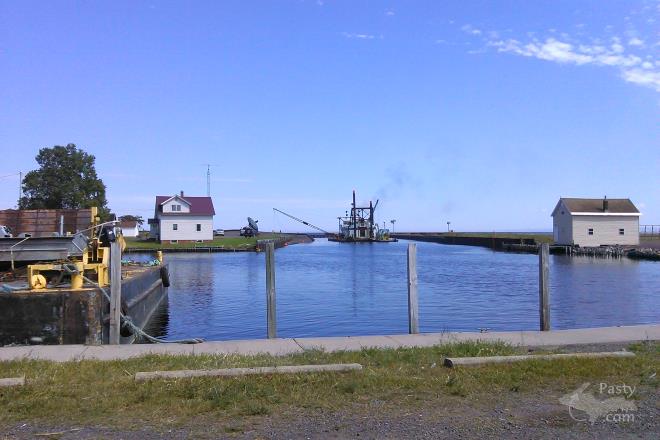 We drove by Grand Traverse Bay this past week and were surprised to see some dredging going on between the irons out there. The barge with the dredging equipment on it was out of Sault Ste. Marie. From what I could tell, there were several large pipelines through which the stamp sand was being moved with, transporting it quite a distance down the shoreline. My husband talked briefly with one of the workers, who told him that it was being piled on DNR property and then the company doing the dredging would come and load it up to transport it somewhere else to be recycled and used in some other process.