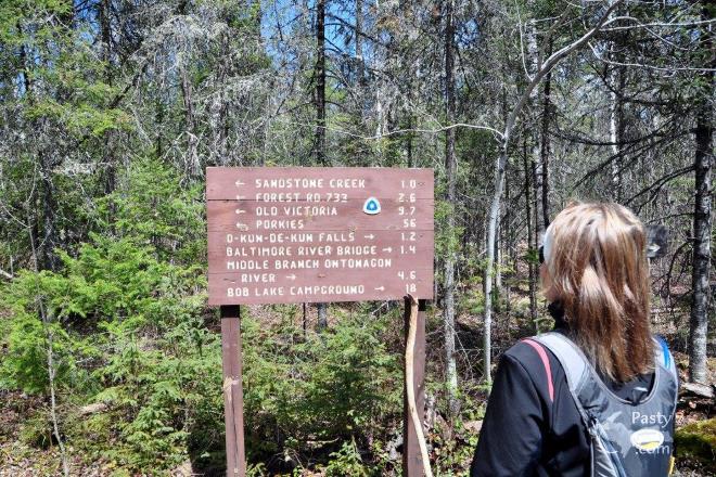 The trail head to the falls is located on the east side of US 45 about 8 miles north of Bruce Crossing. There are signs for the parking area. The trail to the falls is part of the North Country Trail. It is a 1.3 mile fairly level hike to the falls. Before you reach the main falls you will reach a smaller 10' plunge upstream. Keep going! The first time I tried to visit O Kun de Kun I stopped at the upper falls, thinking I had reached my destination. The real falls is just a short distance downstream. The trail crosses a suspsension bridge below the falls. If you have not gone far enough to see the bridge, keep going.