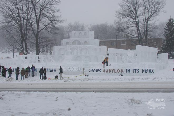 The Michigan Tech Winter Carnival happens in February most years, so the archives the first couple weeks of the month have plenty of Carnival activities going on. Looking back on this day, we find construction underway in 2003, with a shot from Donn de Yampert. You can see how the students “stage” the scaffolding, so as to get to the higher parts of their masterpieces.