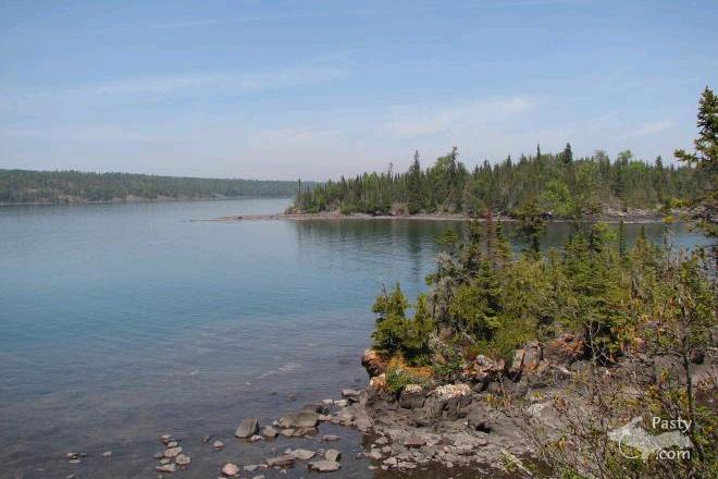 In 2007, we joined Kevin Henriksen over on Isle Royale, where he was hiking around Mott Island and snapped the second photo. It doesn’t look all that different from the shoreline around Eagle Harbor, mostly large rock and trees. Considering there’s only about 40 miles of water in between these two spots, that’s no surprise, really.