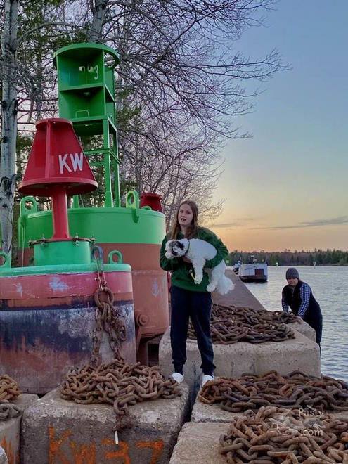 On a peaceful evening, Jeff Dennis and family did some exploring at the Keweenaw Waterway Lower Entrance near Chassell, where the buoys that mark the channel are stored for the winter. That’s his daughter (holding Fritz) and his wife checking out the buoys and giving us a good comparison for how big those buoys really are. Unless you are right next to them, they don’t seem all that big floating in the water.