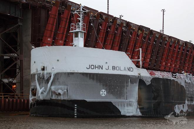With just over a week left before the Soo Locks are closed for the winter season, I thought we'd get a number of freighter photos in this week. In case you haven't noticed, this is the third day that those big ships have graced the Pasty Cam pages, but today we get closer and look at the reality of sailing Lake Superior this time of year. Check out these shots from Rod Burdick, of the John J. Boland in Marquette Harbor. The bow is pretty well coated with a clear sheet of ice, so you know she's been in some rough seas, where the water was washing up good and high or perhaps that could be frozen on there from rain in the air, too. Either way, that's a lot of ice coating that boat.
