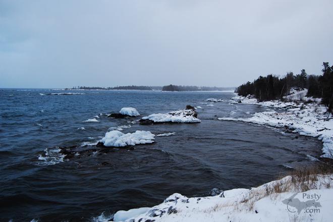 The Big Lake sometimes takes on a darker hue on a cloudy winter day, like the third photo here. The rocks on this section of Superior shoreline, are icy white with frozen waves and a smattering of snow in places, too.