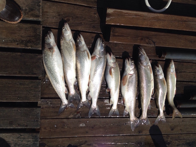 My cousin Ronnie came up to open up the camp in Helltown. The weather was nice so we called Emil and went fishing. We tried for last weeks fish and they had moved on us. We managed to catch a couple of smaller fish but the bigger ones had moved. The lines came up and we started hunting for fish. While running to a new location we located a thermocline down 100 feet. Where the thermocline hit the reef there were some large marks. It looks like we found the trout. The downriggers went down and it wasn't long and a nice 6 pound trout hit. After that it was easy, there were fish marks showing up all over the place. We quit with 12 fish in the box. Ron said he had to drive 400 miles to get a nice catch of fish.