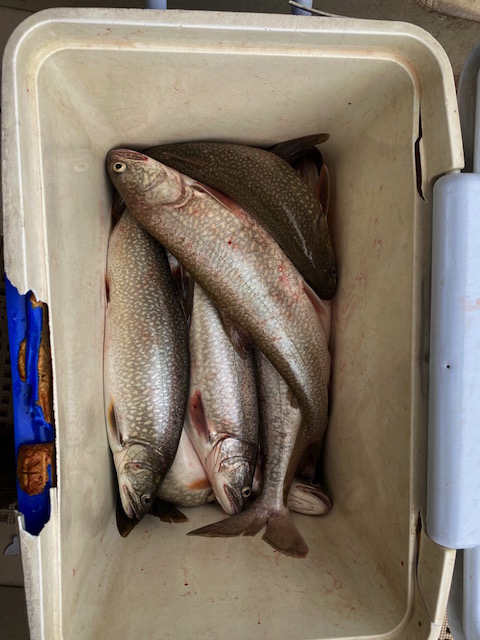 It had calmed down so it was easy to motor out to a 200 foot bobbing hole. The fish were there and it didn't take long and Bruce caught a fish. We had a couple of doubles and finally we filled our box with 10 nice trout.