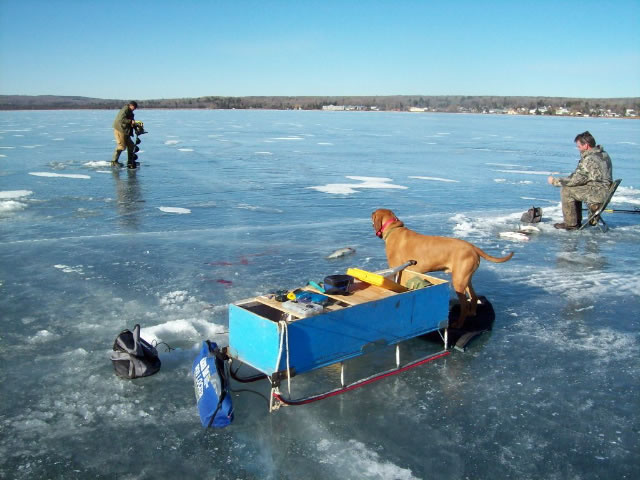 Steve drove and we met up with Whitefish Willy and down to Green Bay we go. Another fantastic trip was planned out to the "honey hole". The sleighs were loaded and hooked to the snow machines. There was a a new pressure crack at the shore and Willy picked a place where he could jump the snow machine across and off we go. The only problem was that on the other side of the crack the ice had pushed under and there was about 6 inches of water on the ice. We didn't see the water on the floating slab till the last second and then it was too late to turn back. He gunned the machine, we launched off the ice slab into the water. I was sitting in the back and my feet were getting wet, I looked down and saw that the snow machine was causing the floating slab to sink and now there was 1 foot of water under the machine. The machine and sleigh made it across although my feet were wet from that experience. Steve was behind us and turned back before he got to the crack. There was a safer and drier place to cross a little way down the shore and he took that easy way across. I don't know if he is smarter or just doesn't like adventure as much as Willy.