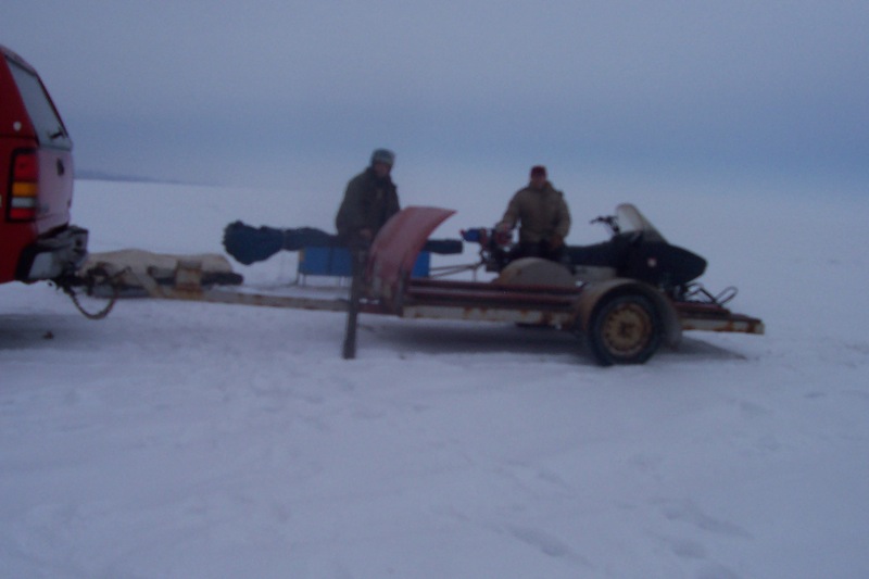 At Pembine Willy's snowmobile and gear was loaded into Steve's truck and snowmobile trailer for the ride down to Green Bay. The "honey hole" was our destination. When we got to the launch point there was not a vehicle in the parking lot, the sun was up, and there was about 3 inches of new snow on the ice, just right to cushion the bumps and make for a nice ride. The two snowmobiles were unloaded and all the gear attached, Steve to his snowmobile and our gear to Willy's. The new towing arrangement was ready for the test. I hopped on behind Willy, down went the throttle, #685 roared to life and we were off. I had to hang on with two hands and try to look behind to see what was happening to our tow. This is difficult when your butt is usually off the seat as we flew over the rough ice. Snowmobile #685 was flying now after Willy removed the rodent nest from the carburetor. Steve was following so we didn't worry about loosing anything. Everything held together and we made it out to the honey hole in record time.