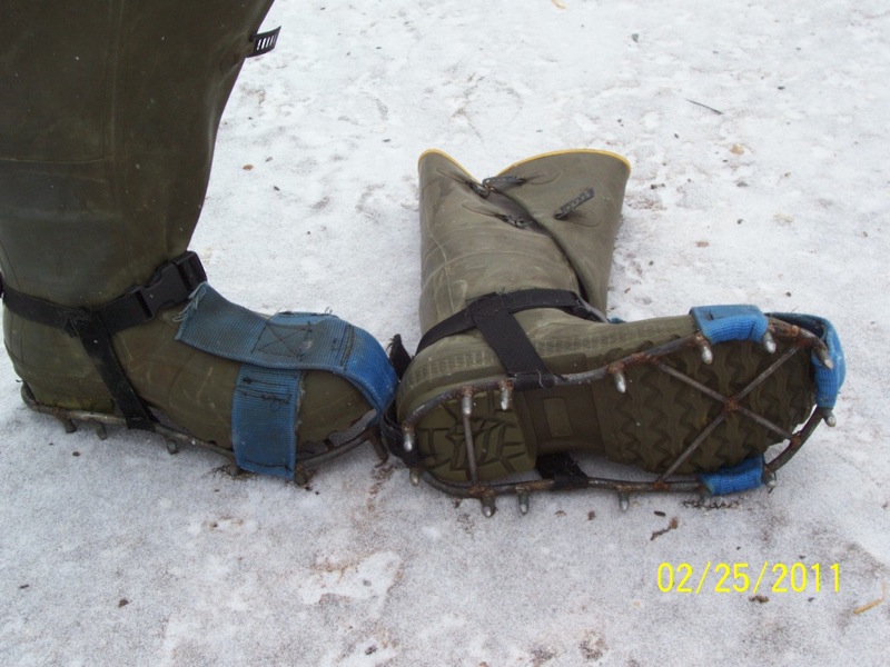 Willy arrived at my house at 7:00 AM. The skunk hole of Escanaba was the destination. Marge and I had talked to a guy coming off the ice the day before and he had 6 whitefish so we knew there were some there. There was a trail down onto the ice just past the boat launch that the city has been so nice to block with the docks so the ice fishermen have to find another place to drive onto the ice. We drove out towards the shore crack but stopped way short of the crack to unload our sleighs. The ice was slick and ice creepers were necessary to keep from slipping. I will take a picture of Willy's home grown ice creepers. The line men for the Green Bay packers would love them for playing on the frozen tundra. The only problem is that they look more like the spikes on a medieval knights club. They could be a deadly weapon if you ever got "spiked" by them. Well we walked out to the crack and there were two planks across the crack and we used them to pull our sleighs across to the fishing grounds. Willy went to the 80 foot depth and I crossed the ice heave and went over to the 60 foot area. I had to cut my holes by hand as Willy had the power auger. The depth finder showed schools of smelt right away. Some were high in the water column but most were near the bottom. The current was strong and most of the time you could not see your jig. It is nice to see your jig so you can watch the fish come off the bottom following your bait. Lots of the followers are active fish and Willy says that they bite better, well at Escanaba they didn't. I caught one whitefish on a salmon egg, Willy lost a couple of whitefish on the jig and we ended up with the one whitefish, one perch, and four smelt for the day. It was a nice day on the lake if you ignore the ice quakes that were going on all morning. We quit at noon do the "old man" could get his nap before playing hockey with the old timers on Sunday night.