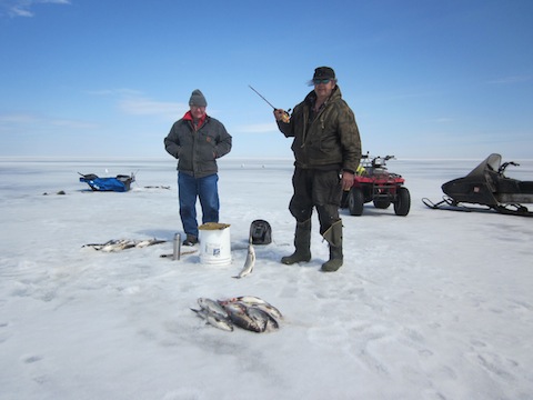We followed the GPS out to our fishing spot. This one was 3 1/2 miles out but the ride out was easy. There is about 4 inches of soft snow on the ice so the travel was easy with the snow machine and sleighs gliding smoothly over the snow. We set up over 65 feet of water and started fishing. Steve caught a couple right off the bat so we were encouraged. Soon I hooked one and landed it. Willy showed up and went out a little farther to try another spot. Steve and I picked the right spot because there were fish under us almost constantly. I had my limit by 12:06 and Steve soon had his. Willy moved over by us and soon he was icing whitefish too. We each ended the day with a limit of whitefish and a lawyer, (burbot). It was one of those days when you didn't need to run your heater because the sun provided all the warmth we needed.