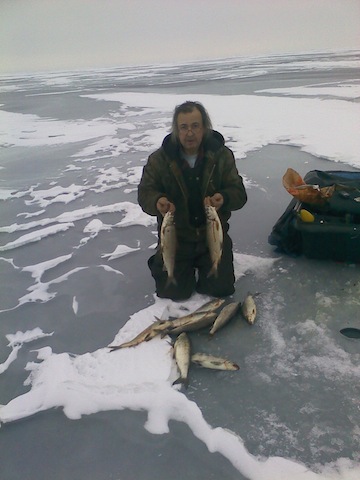 There were lots of fish down there and we all had our limit by 1:00 and called it quits. All the gear was stowed on the plane or sleighs and Steve G. took off. In 500 feet he was airborne and on his way back to lower Michigan. Steve H and I headed for shore and loaded his four wheeler on the trailer. We were not even half way home when we got a call from Steve G that he was on the ground at Cadilac; he beat us home. Now that's the way to go ice fishing.